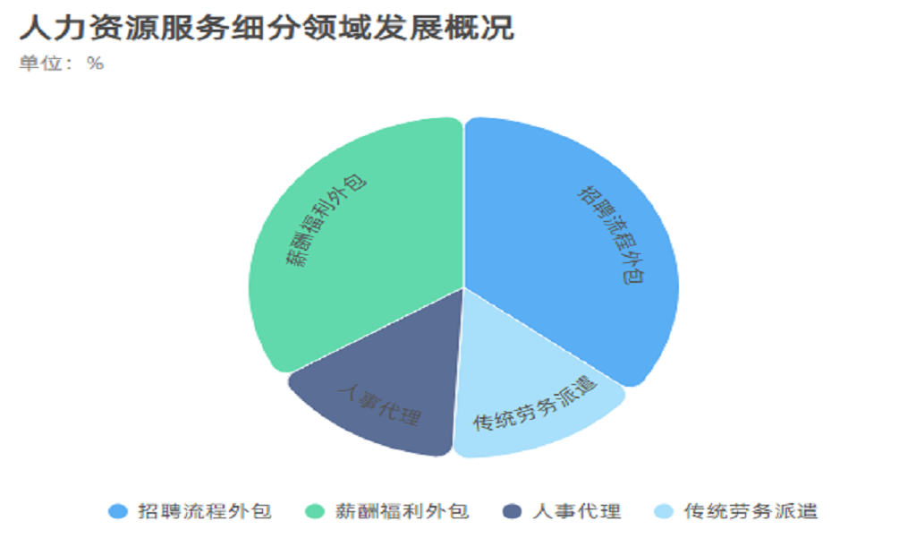 据调查,我国人力资源外包细分领域中,人事代理及传统劳务派遣市场份额高于薪酬福利外包及招聘流程外包,但后两者在增速方面势头强劲。数据显示:2015-2019年,我国招聘流程外包和薪酬福利外包复合增长率分别为21%和20%,远高于人事代理及传统劳务派遣的9%。