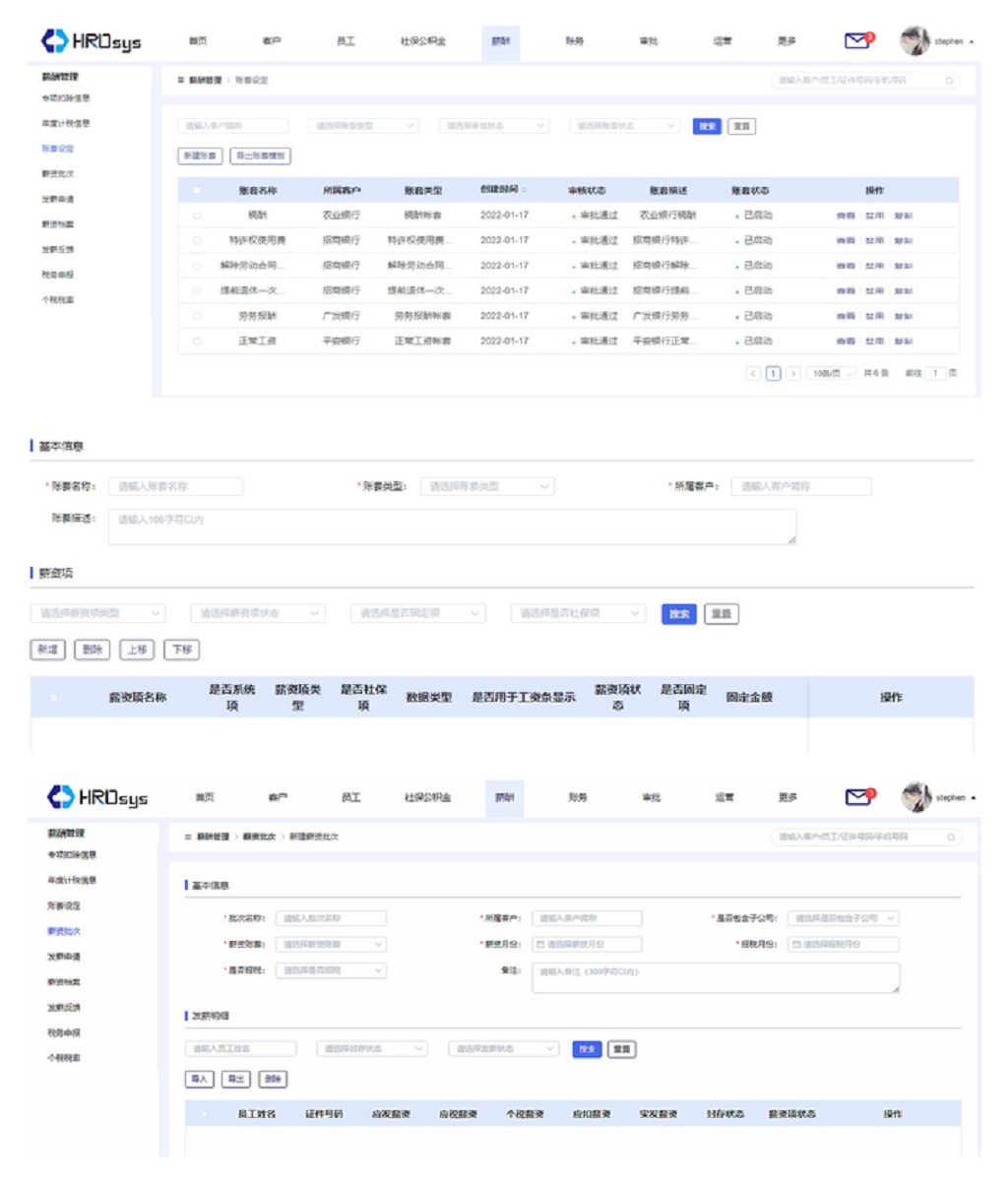 除了薪酬管理模块,系统还支持人力资源外包服务全流程的多种管理服务,包括系统管理、结算管理、员工管理、客户管理 、财务管理、审批管理、运营管理,社保商保管理等,全面满足不同类型、不同阶段的人力资源服务商在服务流程中涉及的多样化功能需求。